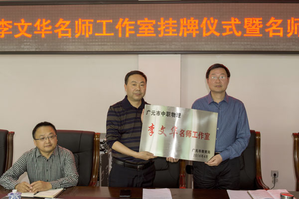 学校李锦校长为广元市中职物理李文华名师工作室授牌并表示祝贺,勉励李永、贾宗太、李文华等三个名师工作室全体成员,要充分发扬团队合作精神,在已有突出教育教学成绩基础上,潜心投入教育教学工作,发现专业教育与德育教育问题,开展教育教学研究工作,解决教育教学问题,强化专业建设与德育教育,突出内涵发展,提高职业教育教学质量,同时要加强对中青年教师的培养指导力度,让三个名师工作室成为教育教学骨干人才的摇篮,带动与引领全市职业教育更多教师成为职业教育教学与专业建设、学校内涵发展工作骨干、成为职业教育名师,成为职业技能指导名匠。