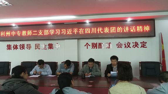 首先,邓松同志组织大家学习了两会习近平总书记两会期间在四川代表团的重要讲话,《关于加强中小学校党的建设工作的意见》和市委书记王菲在全市领导干部集体谈心谈话内容。他要求全体党员同志学习习总书记两会期间的讲话精神,健全支部党建工作管理体制,提升支部党组织建设水平,创新支部党组织活动内容方式,提高党建意识,为学校建设发展做出贡献。