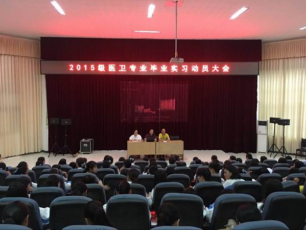 为加强我校实习学生职业道德教育、行为规范教育,引导学生树立正确的就业观、择业观和创业观,在思想上为走上工作岗位做好充分准备,确保安全顺利完成实习任务。2017年6月13日晚我校在教学楼阶梯教室召开了“2015级医卫专业毕业实习动员大会”。安保科马戬科长,实训科冯大军科长及马灿副科长出席了会议,2015级全体学生参加了动员会。
