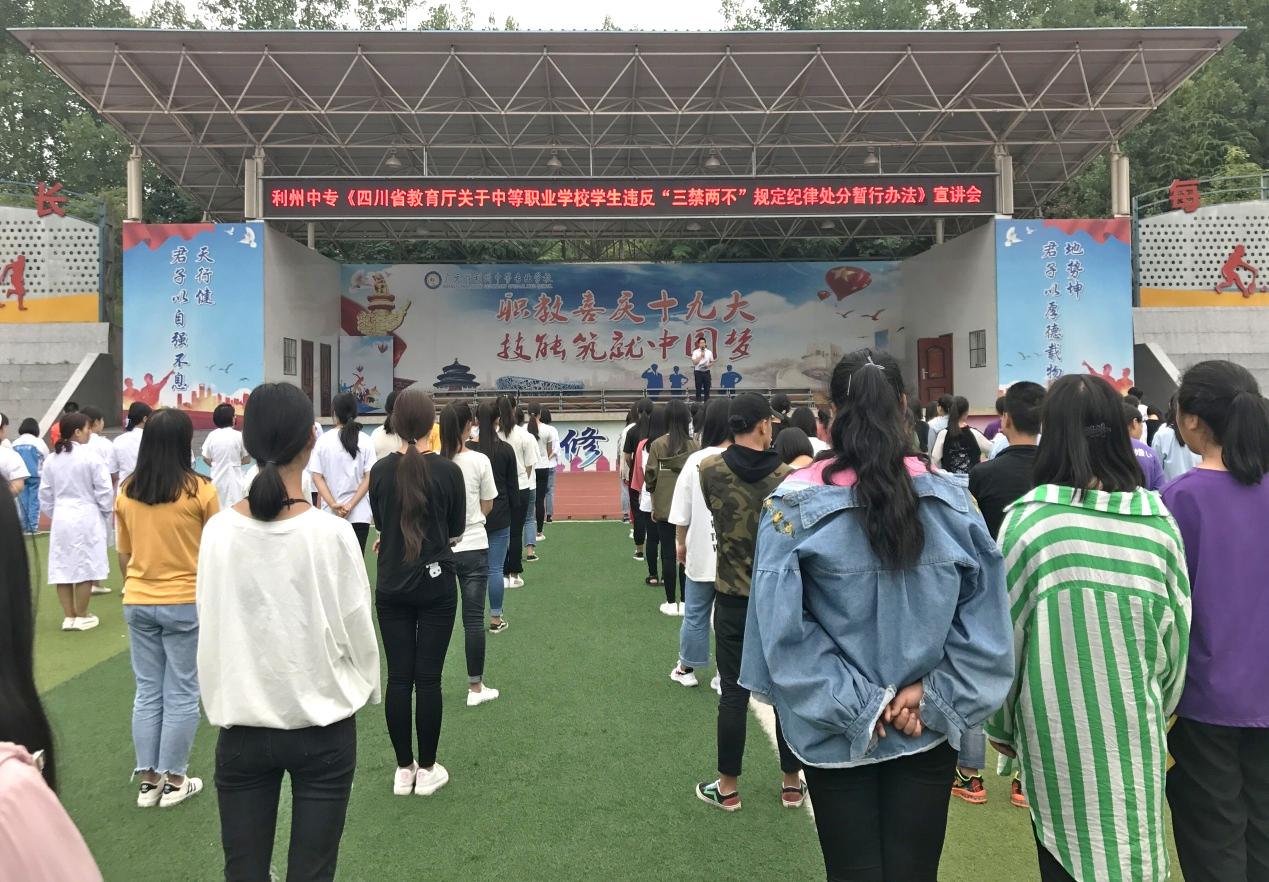 为培养学生良好行为习惯,增强学生法纪意识,努力维护学校安全和正常的教育教学秩序,促进学生全面健康成长,2018年5月30日上午10点,学生科组织召开了《四川省中职学校学生违反〈三禁两不十不准〉纪律处分暂行办法》宣讲会,全校2000余学生及班主任老师在田径场参加了宣讲会。