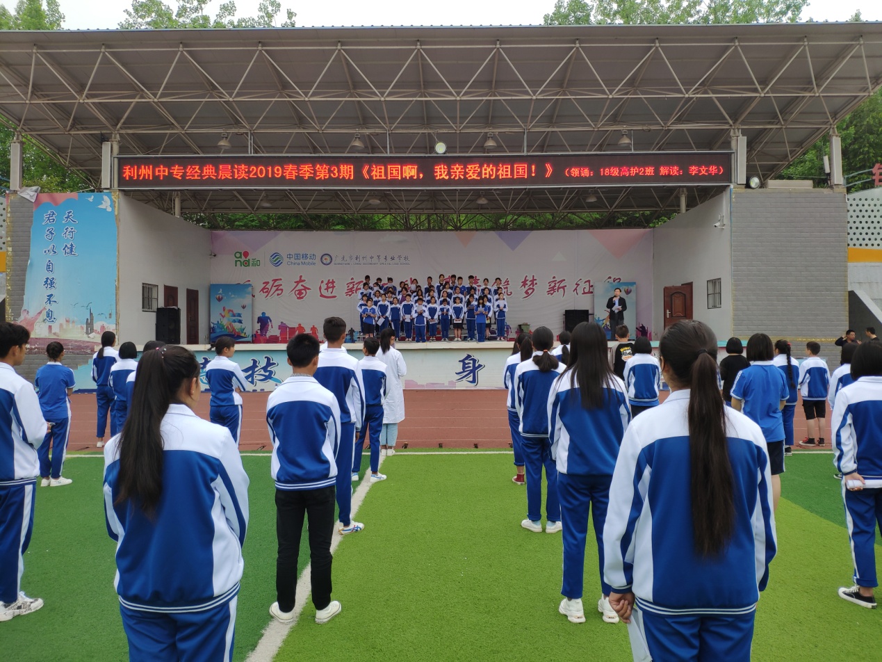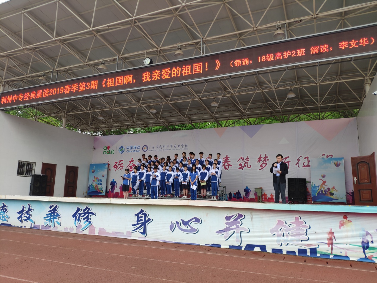 2019年4月24日早晨,学校围绕“4.23国际读书节”主题活动,举行了2019春季第3期经典晨读活动,全体2018级学生整齐列队于学校田径场,在2018级高护2班全体同学的领诵下高声吟诵了舒婷的代表作――《祖国啊,我亲爱的祖国》。