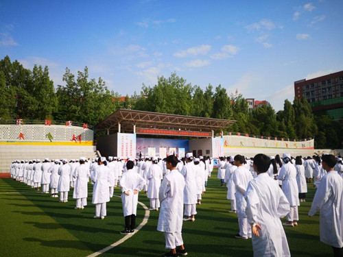 上午8时,开幕式在学校运动场举行,此次大赛由医卫教学部主办,王怡名师工作室承办,她首先祝全体同学们节日快乐,希望同学们以大赛为契机,加强自身临床技能操作水平,提升业务素质,同时在比赛中以赛会友、以赛查漏、以赛提升、赛出水平、赛出风采。