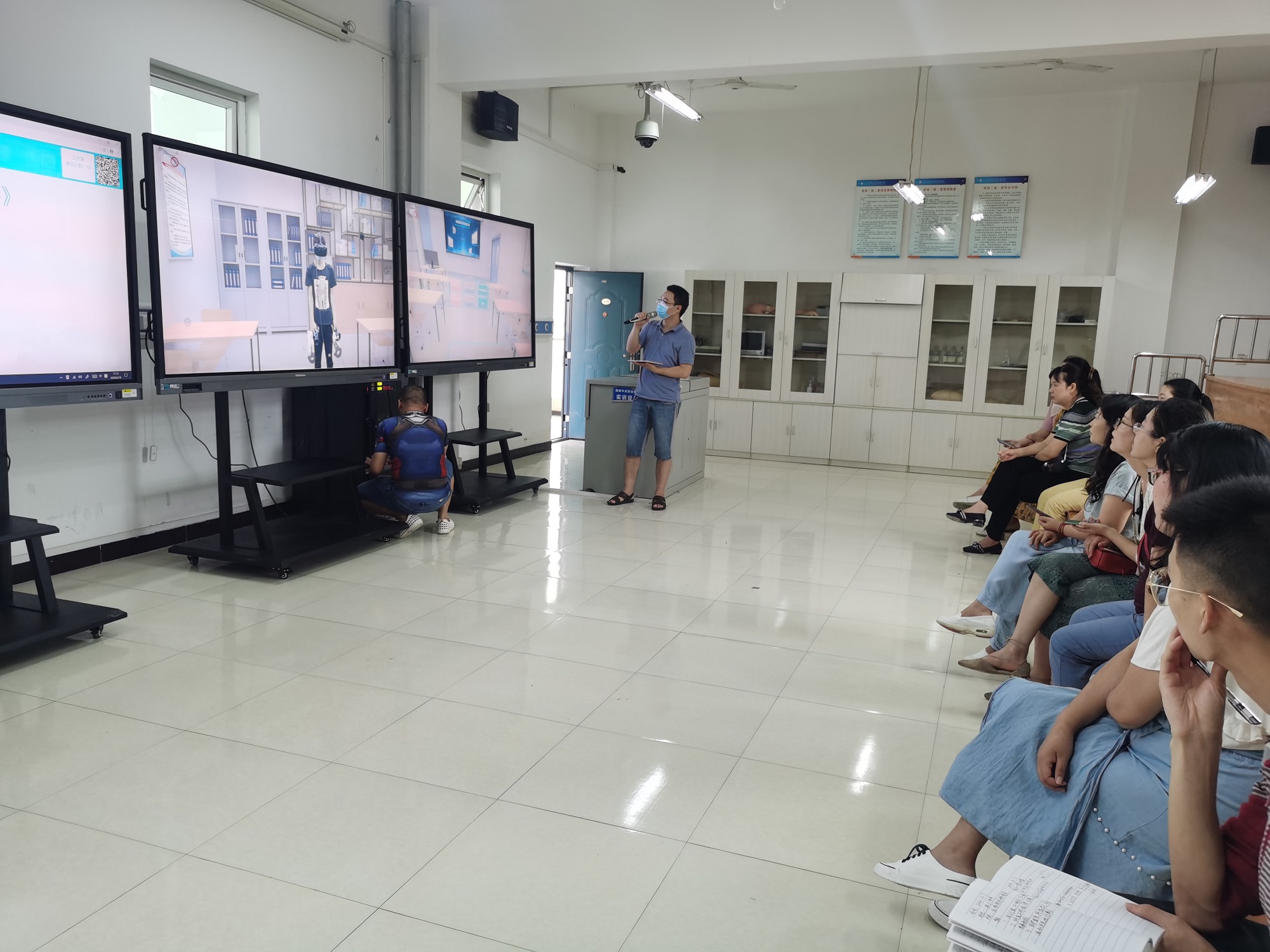 在培训中,操作技术人员对互动式VR虚拟系统进行详细解读和示范,向老师们讲解了完整的操作流程,并列出了“急救救援与处理措施”等不同场景模块的虚拟教学和虚拟体验操作,并介绍了互动大屏、MR大屏和VR大屏的适用范围及满足不同教学情景的需求。