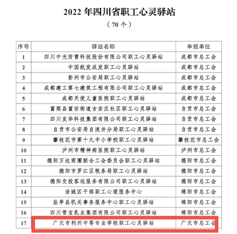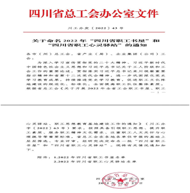 近日,根据《关于命名2022 年“四川省职工书屋 ”和“四川省职工心灵驿站”的通知》(川工办发[2022]43号)精神,我校职工心灵驿站被命名为“四川省职工心灵驿站”。