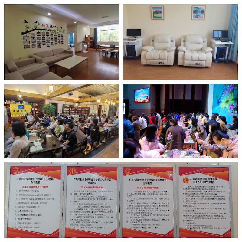 广元市利州中等专业学校职工心灵驿站设施设备齐全,功能分区科学合理,配有专业心理测评软件,为全校教职工建立了动态心理档案;拥有专兼职心理咨询师6名(其中心理学硕士研究生1名,国家二级心理咨询师2人,国家三级心理咨询师2人,高级家庭教育指导师1人)。心灵驿站投入使用以来,根据全校教职工年龄、性别等常年开展个别辅导和集体心理讲座,开展茶话会、读书会等活动,成效明显,每年平均开展心理服务活动8次,服务教职工200人次、服务学生3000人次。同时,心灵驿站开通了微信公众号“亦心舍”,推广宣传心灵驿站活动,深受全校师生好评。