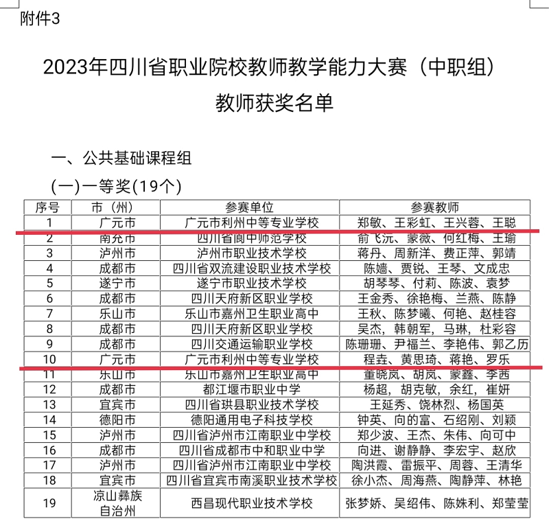 2023年7月17日,四川省教育厅公示了2023年四川省职业院校教师教学能力大赛获奖名单,利州中专5个教学团队共20位教师参与角逐,他们历经网络初选、课堂教学展示、综合素养展示的层层比赛,最终斩获一等奖2项,三等奖3项。其中一等奖分别为郑敏、王彩虹、王兴蓉、王聪组成的思政团队和程??、黄思琦、蒋艳、罗乐组成的数学团队。