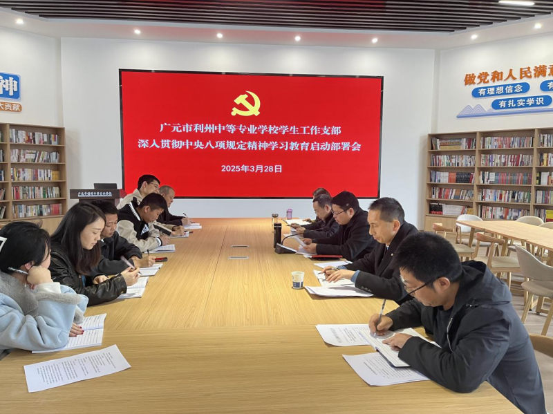 会议传达学习了中共中央办公厅《关于在全党开展深入贯彻中央八项规定精神学习教育的通知》精神和学校党委深入贯彻中央八项规定精神学习教育启动部署会议精神,宣读了学校党委《关于在利州中专开展深入贯彻中央八项规定精神学习教育的实施方案》。