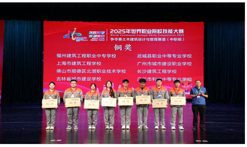 热烈祝贺建筑工程造价专业在2025年世界职业院校技能大赛争夺赛土木建筑设计与管理赛道(中职组)斩获铜奖!参赛学生:孙伟、母倩、王雨涵、张子怡,指导教师:吴玲、刘七宁。