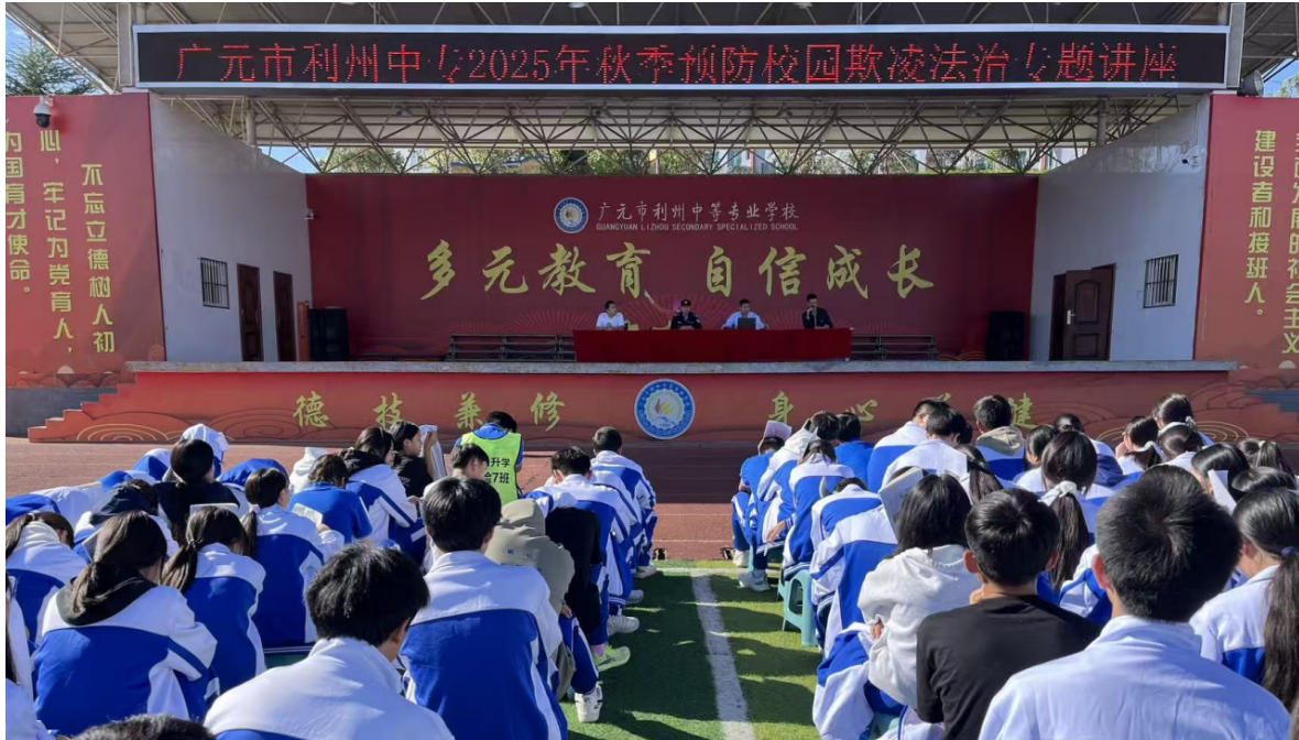 为增强青少年法治意识,营造安全、文明、和谐的校园环境,2025年10月15日,我校特邀学校法律顾问、四川同方正(广元)律师事务所白志城律师,为全校师生带来了一场题为“防范校园欺凌,共建阳光校园”的法治教育专题讲座。出席本次讲座的还有学校法治辅导员,利州区公安局上西派出所陈柬刚警官。